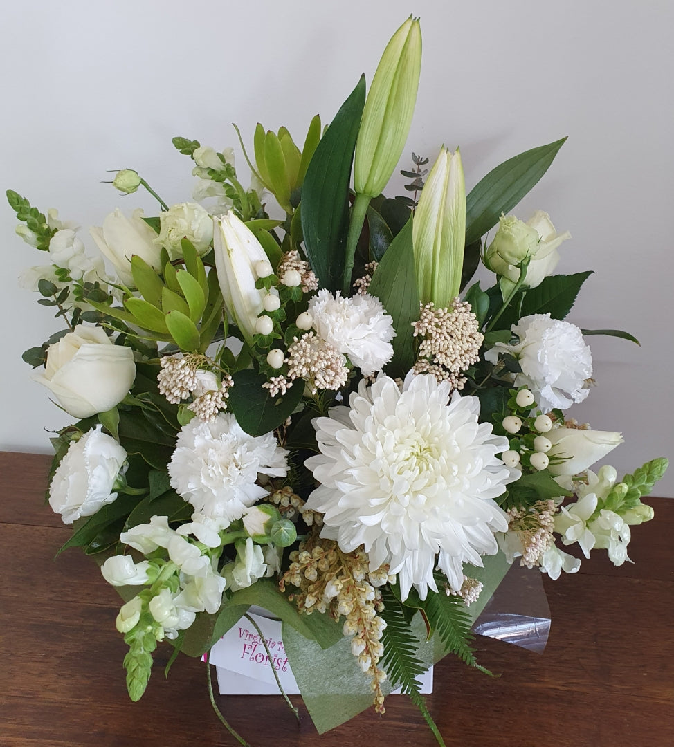 Unit price perPurity offers a stunning box arrangement of white and green flowers. With its elegant design and fresh color palette, it brings a feeling of purity and beauty to any space. The arrangement is designed around white oriental lilies but other flowers will vary on stock available.