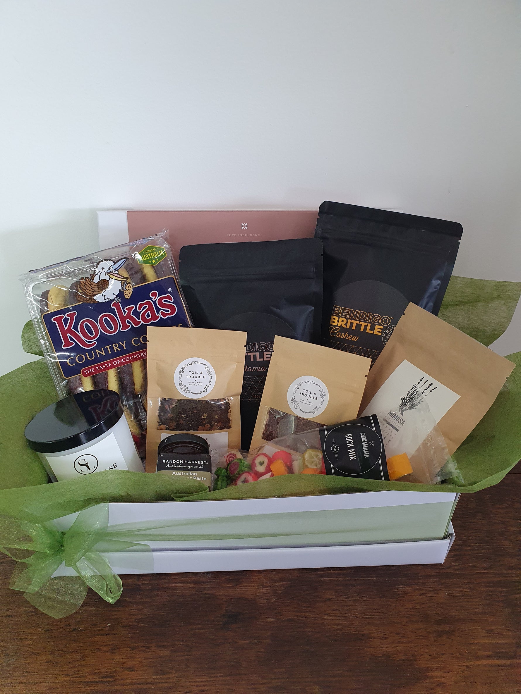 Unit price perA hamper filled with handcrafted gifts all made in Australia. Bendigo brittle made locally in Bendigo. Wood wick scented candle made in Lilydale. Chocolatier chocolates made in Melbourne & teas handcrafted in Orange,Kookas cookies made in Donald, Chocamama Lollies & chocolates made in Melbourne