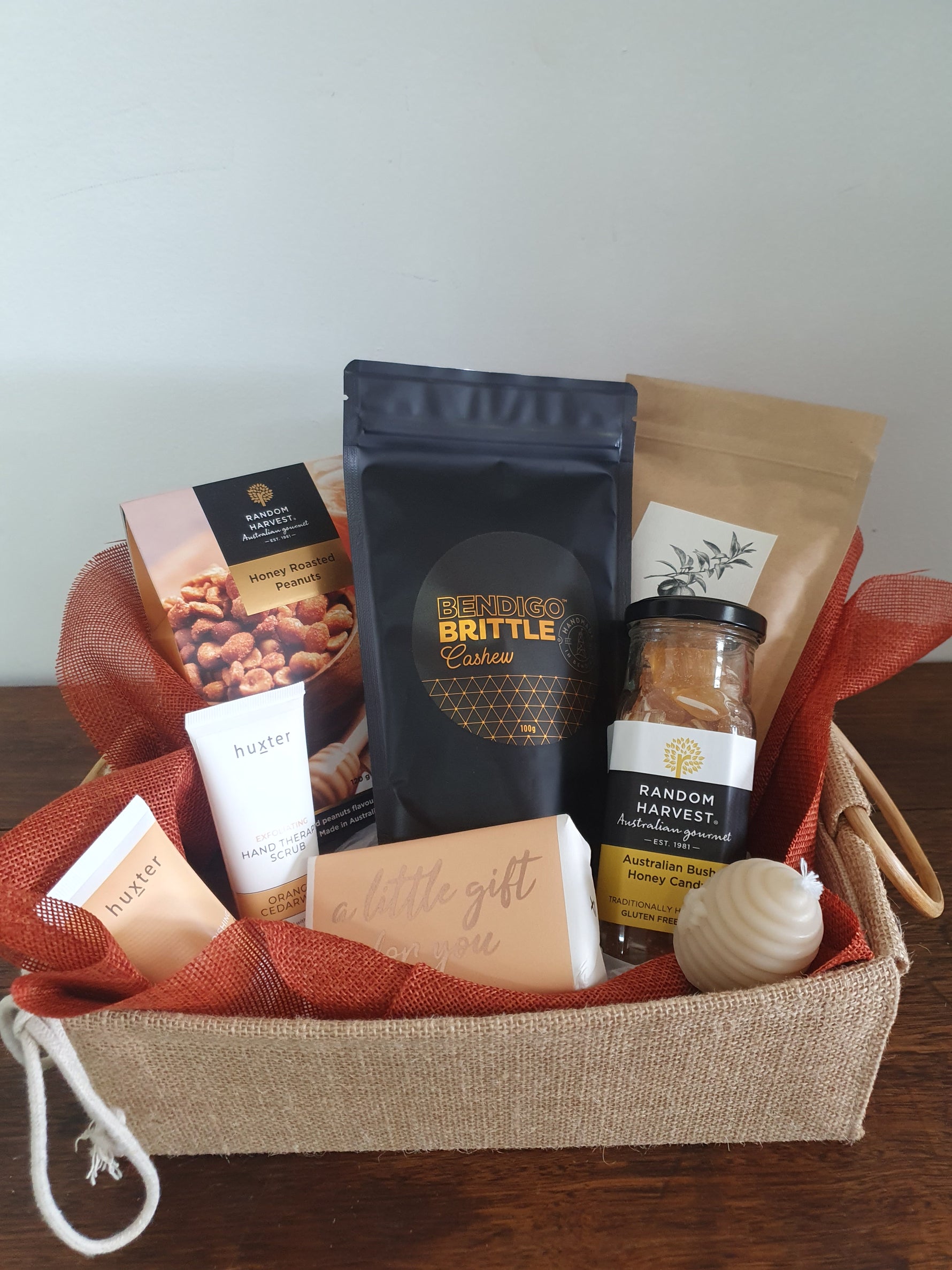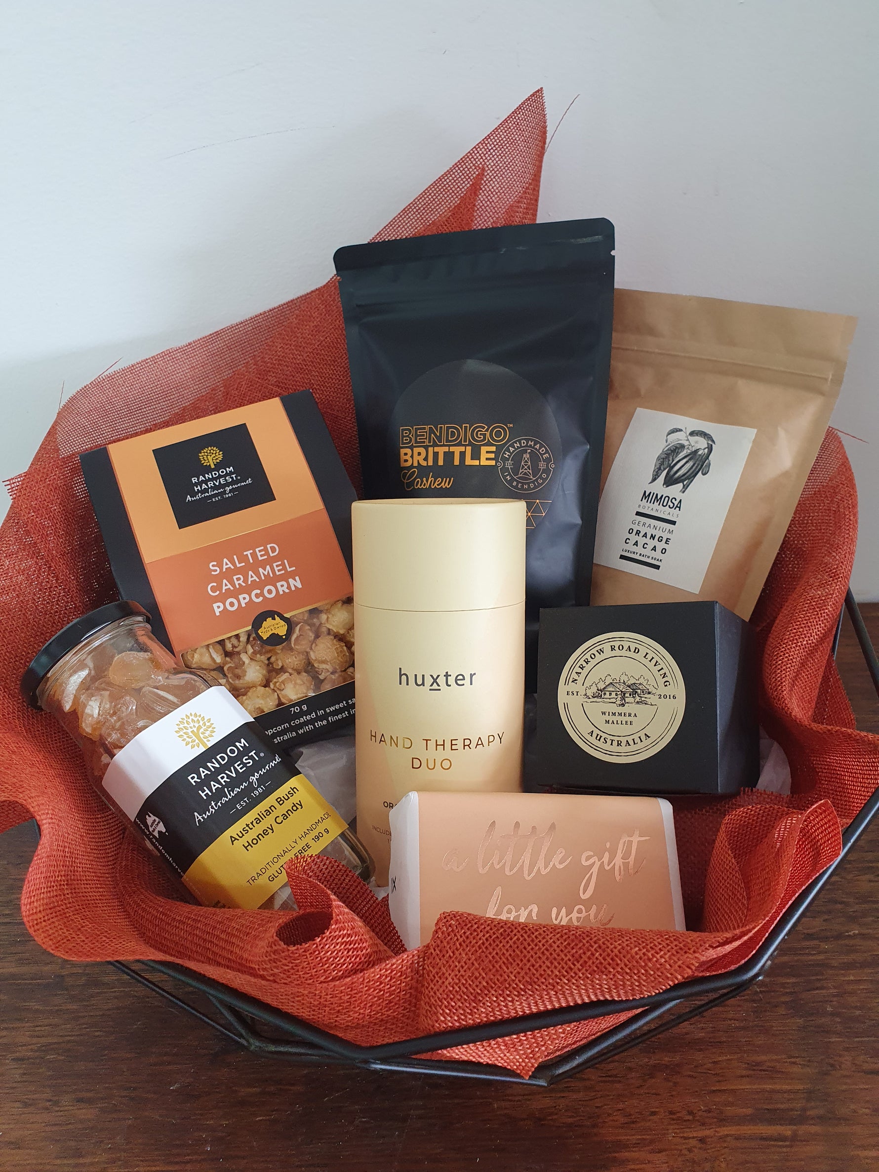Indulge in our Natural Beauty gift basket the large featuring a sleek black wire basket while the medium is a hesian styled tray basket filled with luxurious treats. Treat a special someone to tripple milled soap and nourishing hand cream. They can relax with a fragrant bath soak and pure beeswax candle. Satisfy their sweet tooth with Australianbush honeycandy, honey popcorn or peanuts , and Bendigo brittle. They can transform their home into a tranquil spa with this indulgent gift basket.